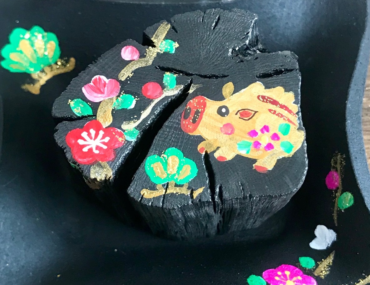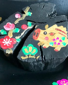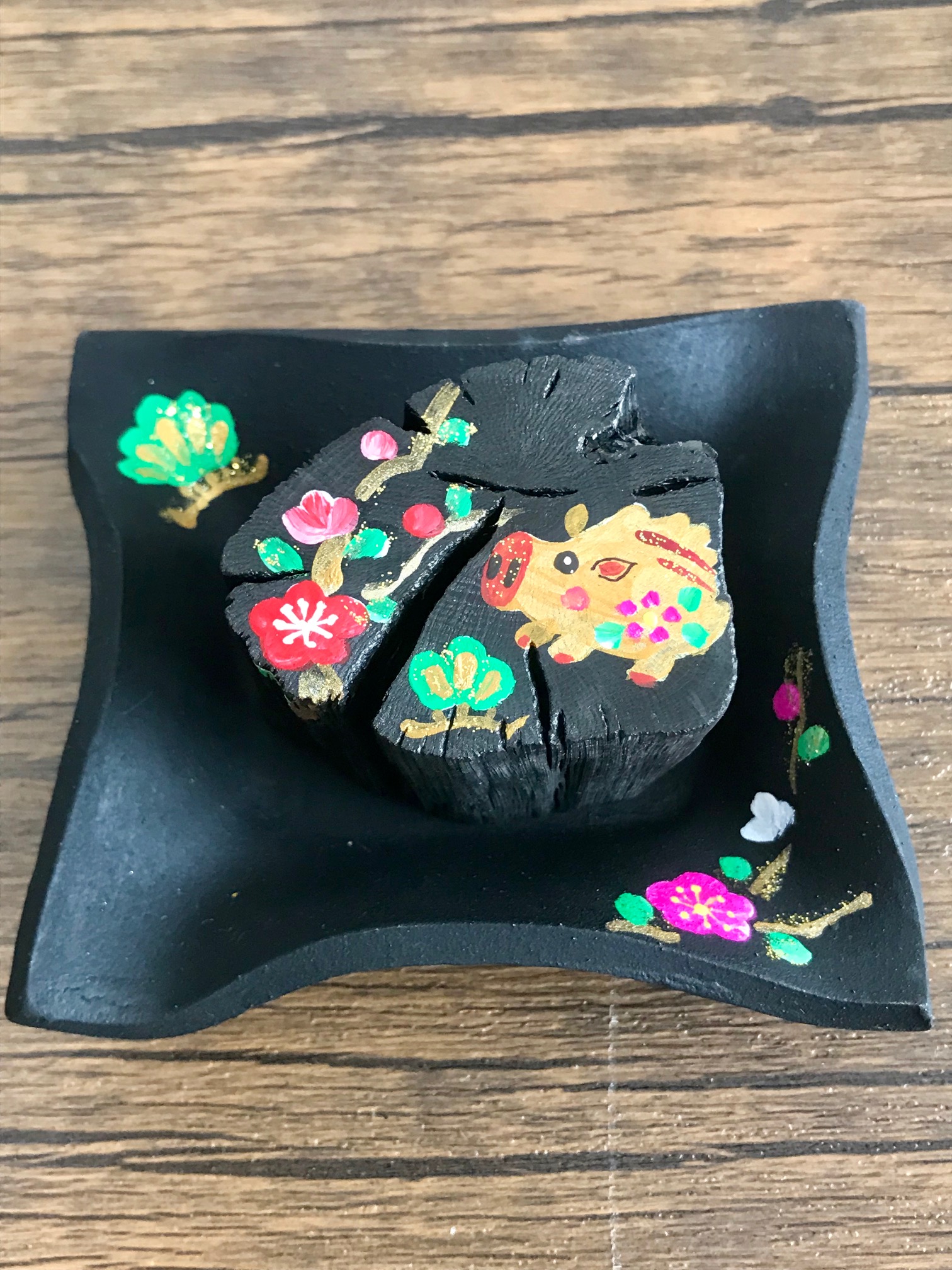 おめでたい干支の絵柄をひとつひとつ備長炭に手描きしています。お誕生日プレゼントに最適です。