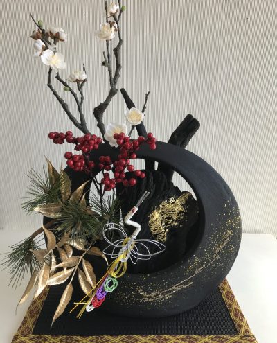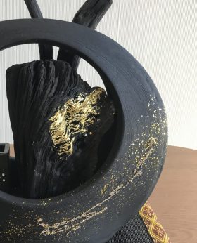 お正月に炭を飾ると「炭の黒が邪気を祓う」と云われています。迎春仕様の備長炭オブジェで、新しい年をお迎えください。希少な「備長炭変り炭」に「本金箔」を施した最新作品です。お花を変えることで、迎春後の使用も可能です。「消臭・除湿を兼ねたインテリア」として、玄関やお部屋にお飾り下さい。